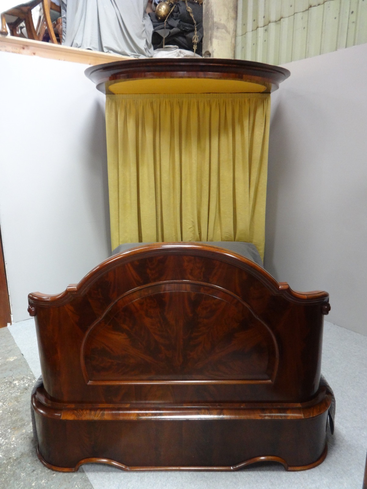 A wonderful mahogany 5ft Victorian half tester bed, in excellent condition with gold drapes. Curved base.