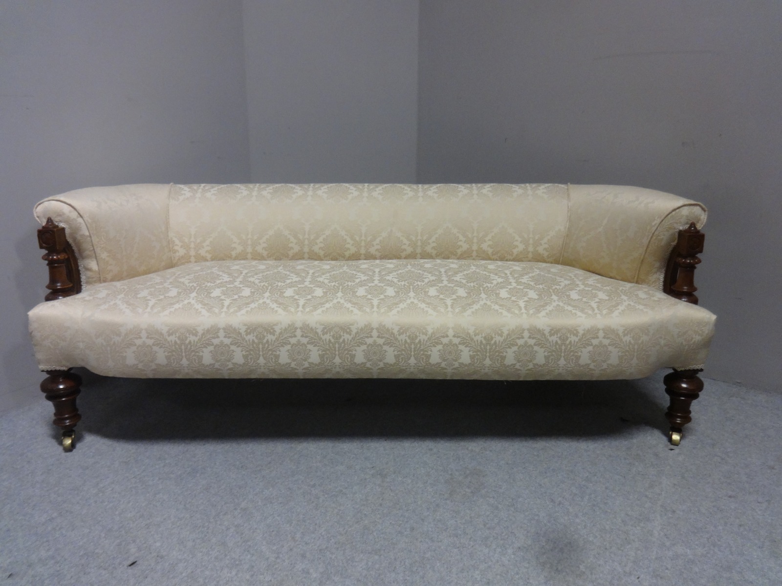 A very pretty Victorian walnut framed sofa, newly upholstered in pale gold damask fabric, in excellent overall condition.